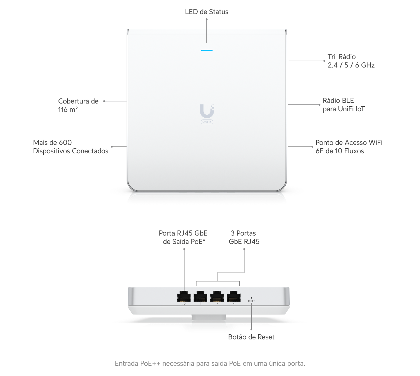 AP WiFi 6E In‑Wall de 10 fluxos com switch integrado (até 4 portas).
