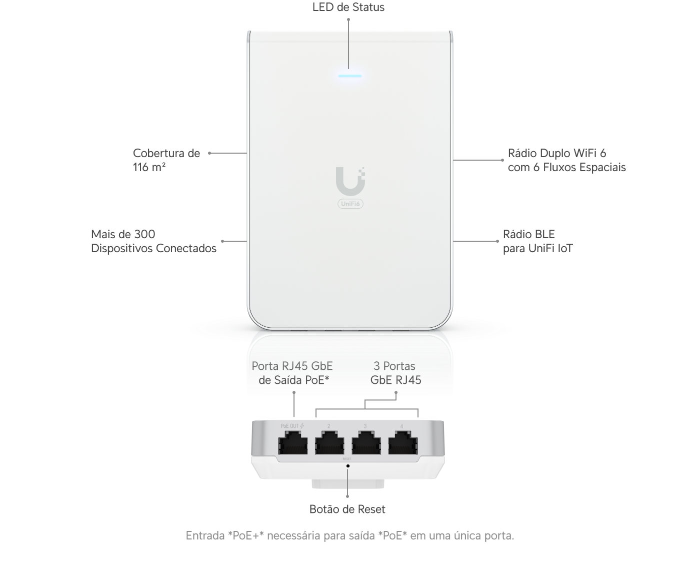 U6 In‑Wall substitui tomadas de rede por um AP + switch discreto e de alto desempenho.